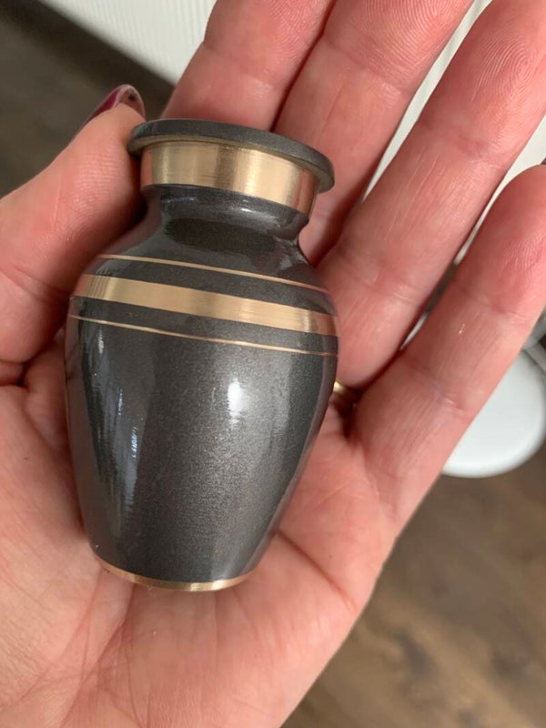 Mini urn in de kleur antraciet/grijs met goudkleurige details.