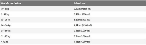 Op de laatste afbeelding ziet u een tabel met richtlijn voor de hoeveelheid crematie-as en het bijbehorende formaat van de urn. Houdt er rekening mee dat de exacte hoeveelheid as kan variëren.