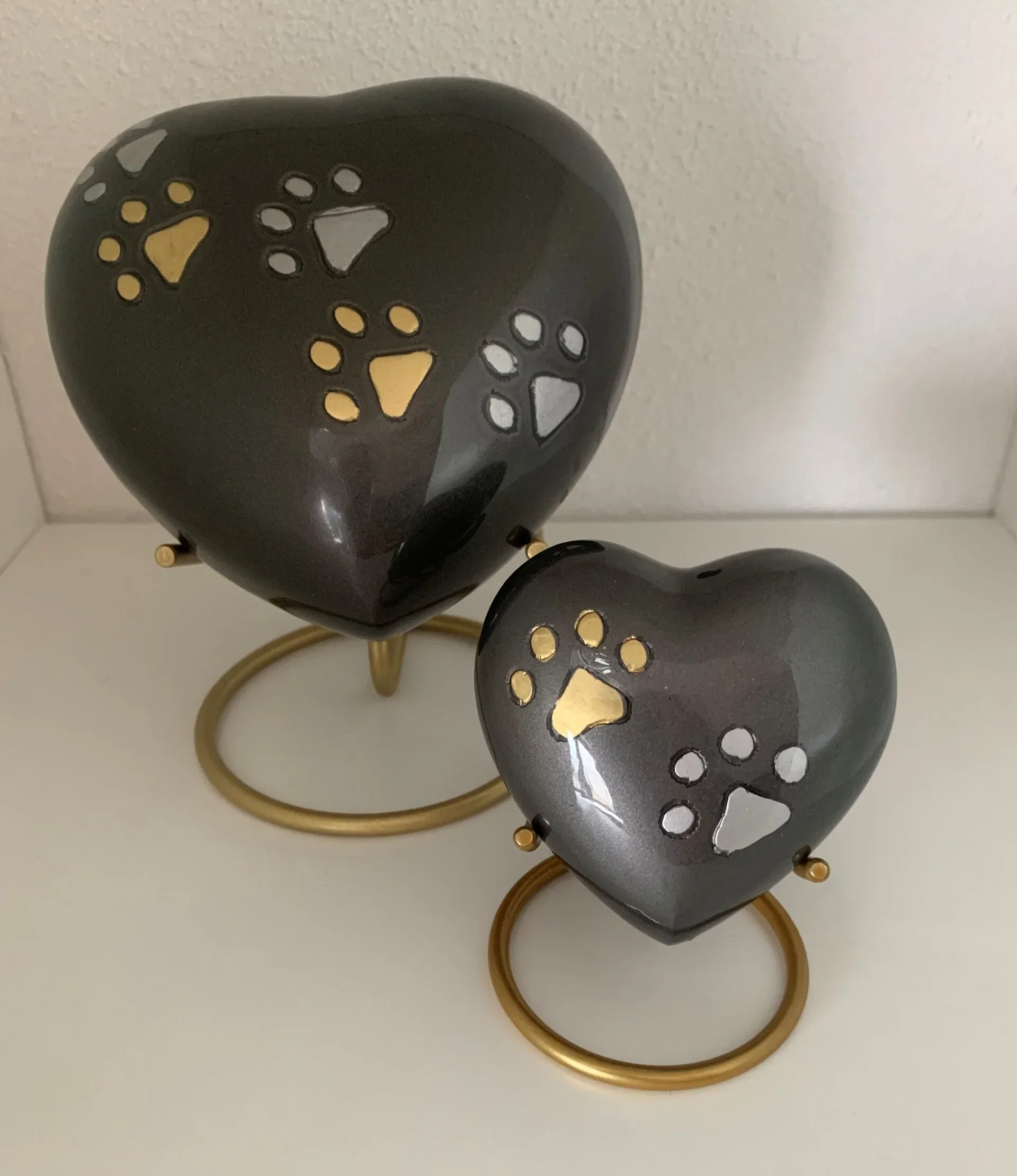 Metalen dierenurn hart grijs pootafdruk. Verkrijgbaar in maat Small en Large.